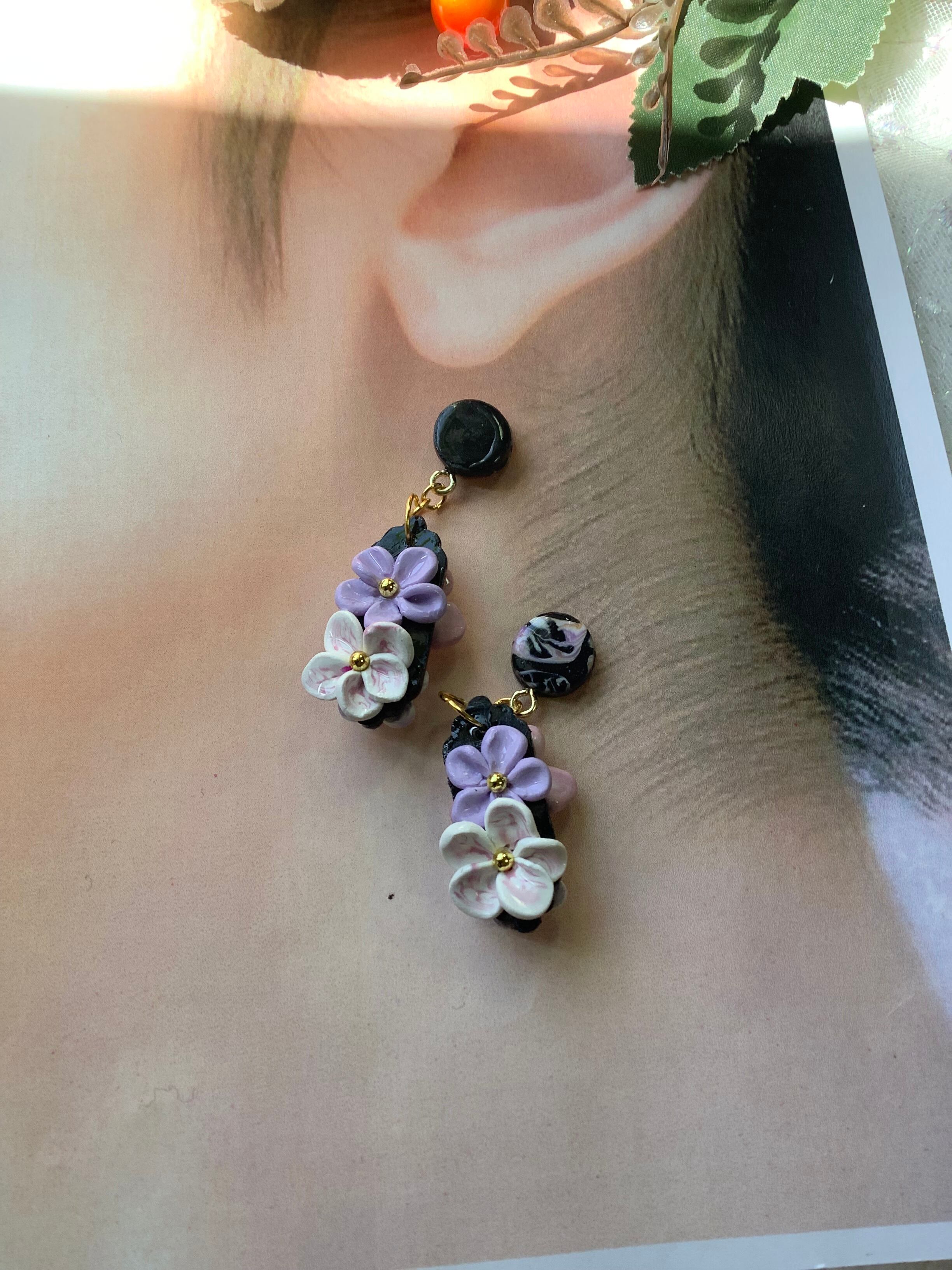 黒地の表面にピンクグラデーションのお花❗️裏面にむらさきのお花がゆれるポリマークレイでおしゃれに優しく、可愛く❤️ゴージャスに‼️一点物です❗️視線を集めること間違いなしです。ポリマークレイの素材感が生み出す独特の表情と、鮮やかなカラーリングが特徴のアイテムです。日常使いにも特別な日にもぴったりで、どんなコーディネートにも合わせやすいアクセサリーとしていかがでしょう