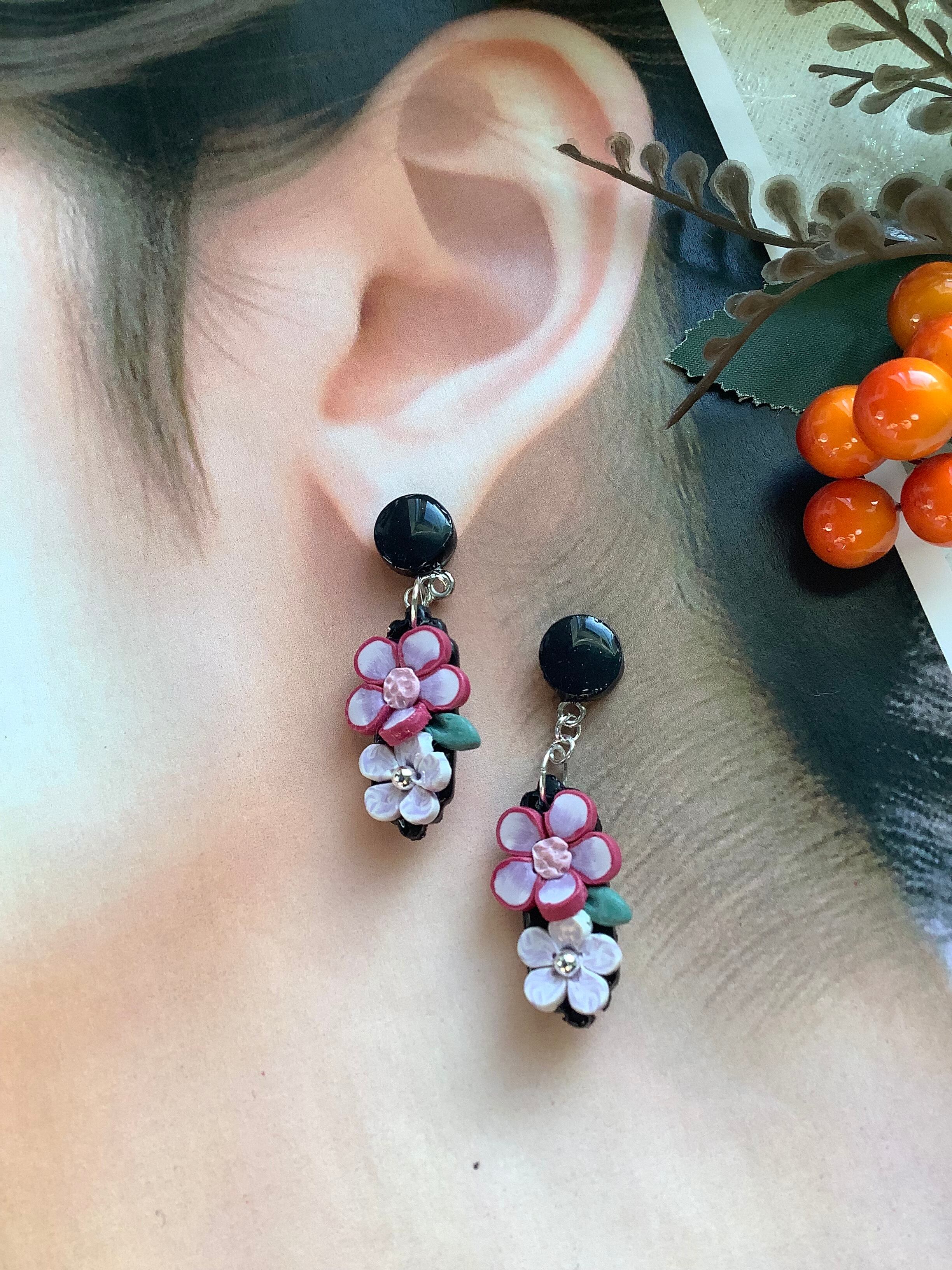 黒地に表面に赤とむらさきグラデーションのお花、裏面に小さなむらさきのお花がゆれるポリマークレイでおしゃれに優しく、可愛く❤️ゴージャスに‼️一点物です❗️視線を集めること間違いなしです。ポリマークレイの素材感が生み出す独特の表情と、鮮やかなカラーリングが特徴のアイテムです。日常使いにも特別な日にもぴったりで、どんなコーディネートにも合わせやすいアクセサリーとしていかがでしょう