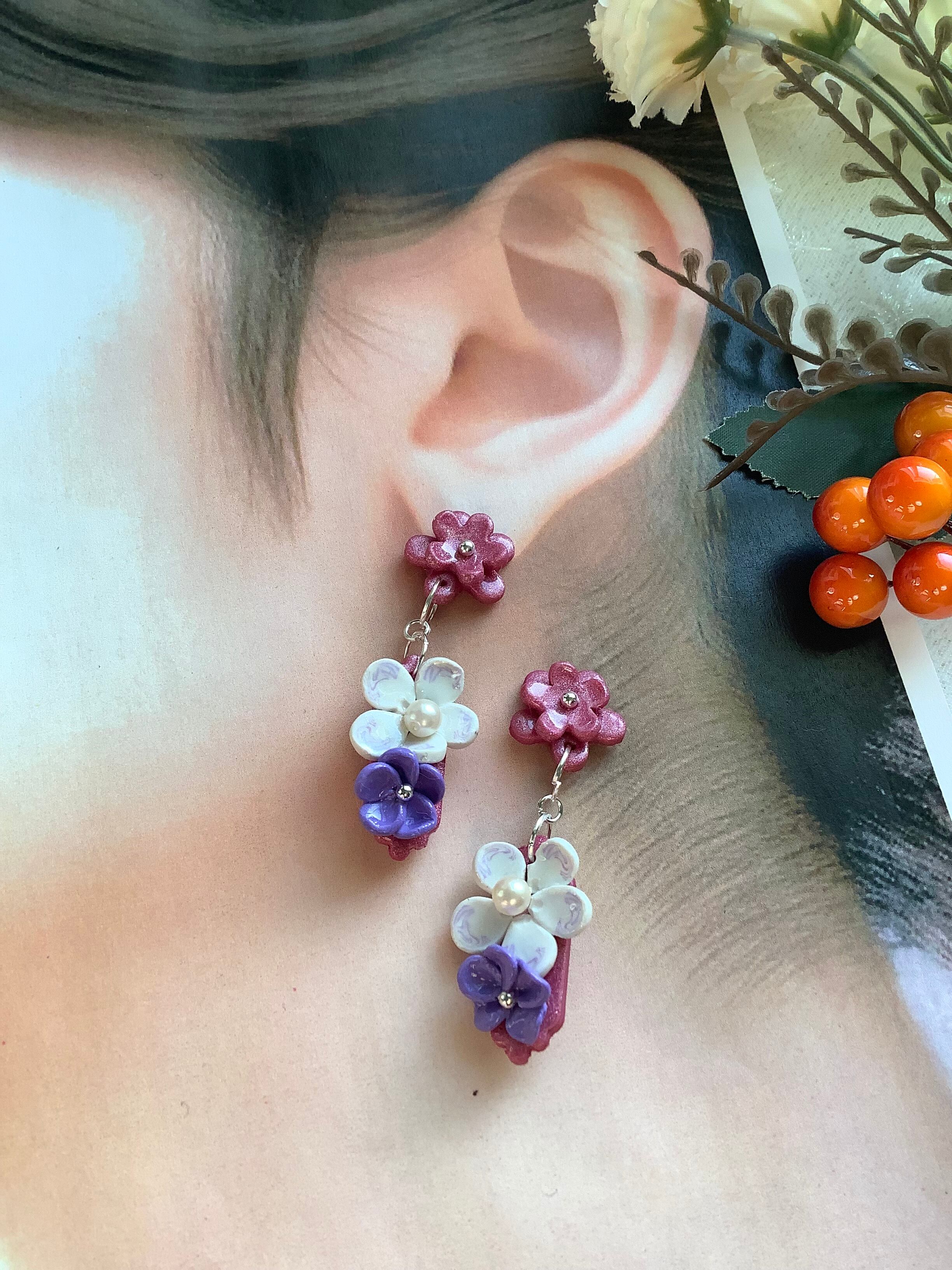 紅色に白とむらさきグラデーションお花とむらさき小花でおしゃれに優しく、可愛く❤️一点物です❗️視線を集めること間違いなしです。ポリマークレイの素材感が生み出す独特の表情と、鮮やかなカラーリングが特徴のアイテムです。日常使いにも特別な日にもぴったりで、どんなコーディネートにも合わせやすいアクセサリーとしていかがでしょう