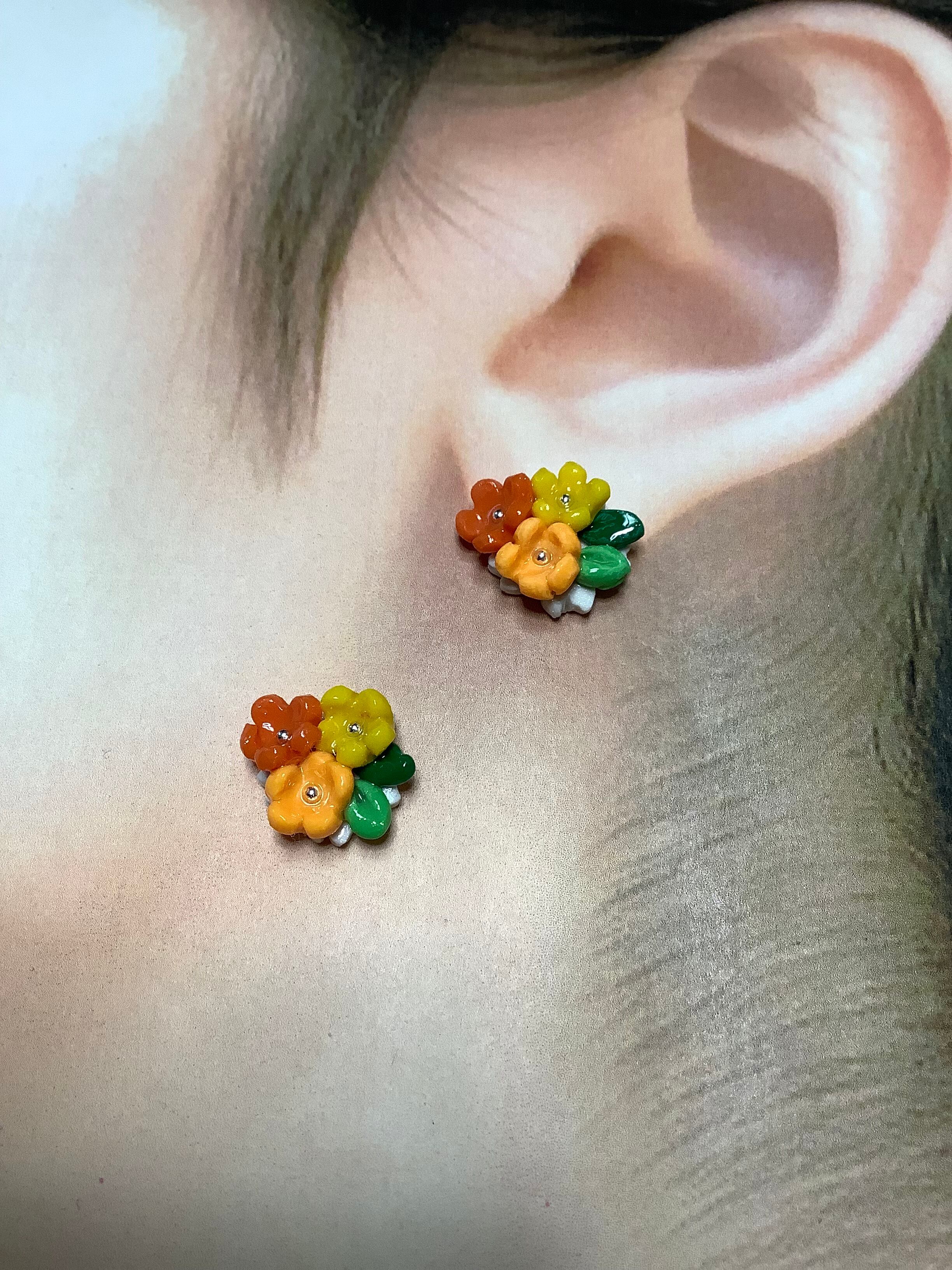 パール白地にオレンジや黄色の小花で、おしゃれに可愛く❤️一点物です❗️視線を集めること間違いなしです。ポリマークレイの素材感が生み出す独特の表情と、鮮やかなカラーリングが特徴のアイテムです。日常使いにも特別な日にもぴったりで、どんなコーディネートにも合わせやすいアクセサリーとしていかがでしょう