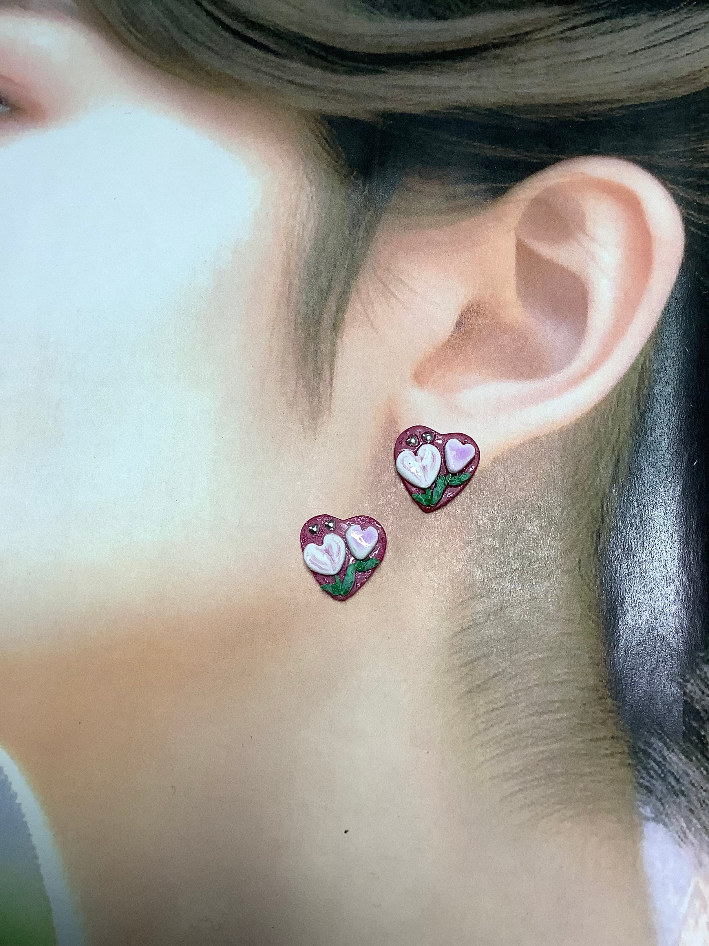 ハート型紅色地に白や赤のグラデーション小花で、おしゃれに可愛く❤️かわいいです❗️視線を集めること間違いなしです。ポリマークレイの素材感が生み出す独特の表情と、鮮やかなカラーリングが特徴のアイテムです。日常使いにも特別な日にもぴったりで、どんなコーディネートにも合わせやすいアクセサリーとしていかがでしょう