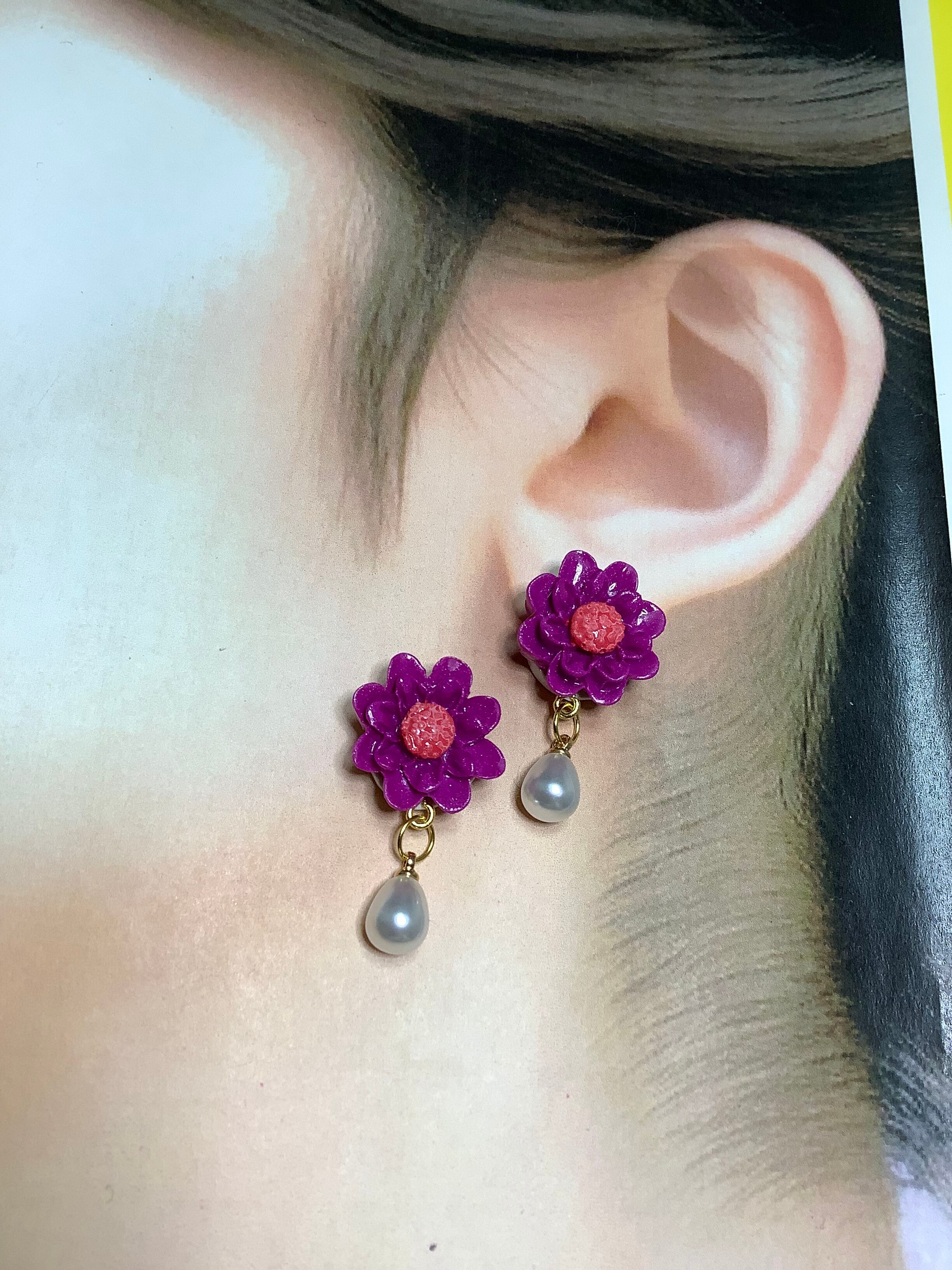 ワインレッドのお花にゆれるパールビーズで、おしゃれに可愛く❤️かわいいです❗️視線を集めること間違いなしです。ポリマークレイの素材感が生み出す独特の表情と、鮮やかなカラーリングが特徴のアイテムです。日常使いにも特別な日にもぴったりで、どんなコーディネートにも合わせやすいアクセサリーとしていかがでしょう