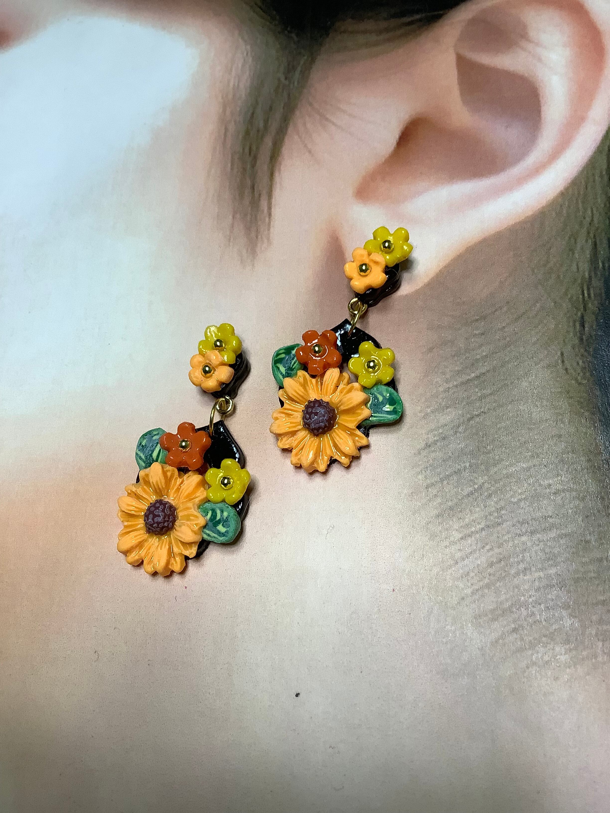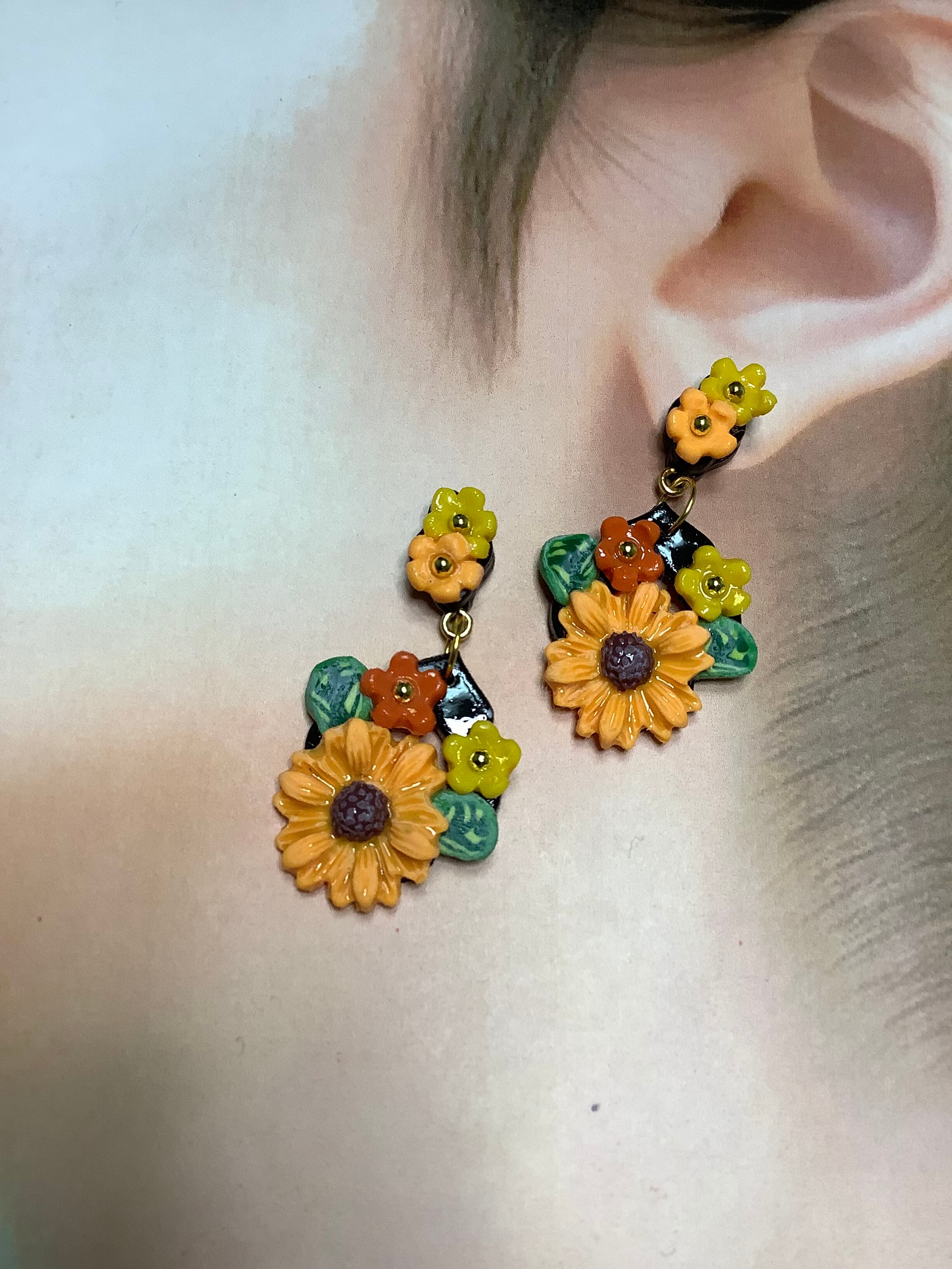 黒地にひまわりやオレンジ小花で、おしゃれに可愛く❤️かわいいです❗️視線を集めること間違いなしです。ポリマークレイの素材感が生み出す独特の表情と、鮮やかなカラーリングが特徴のアイテムです。日常使いにも特別な日にもぴったりで、どんなコーディネートにも合わせやすいアクセサリーとしていかがでしょう