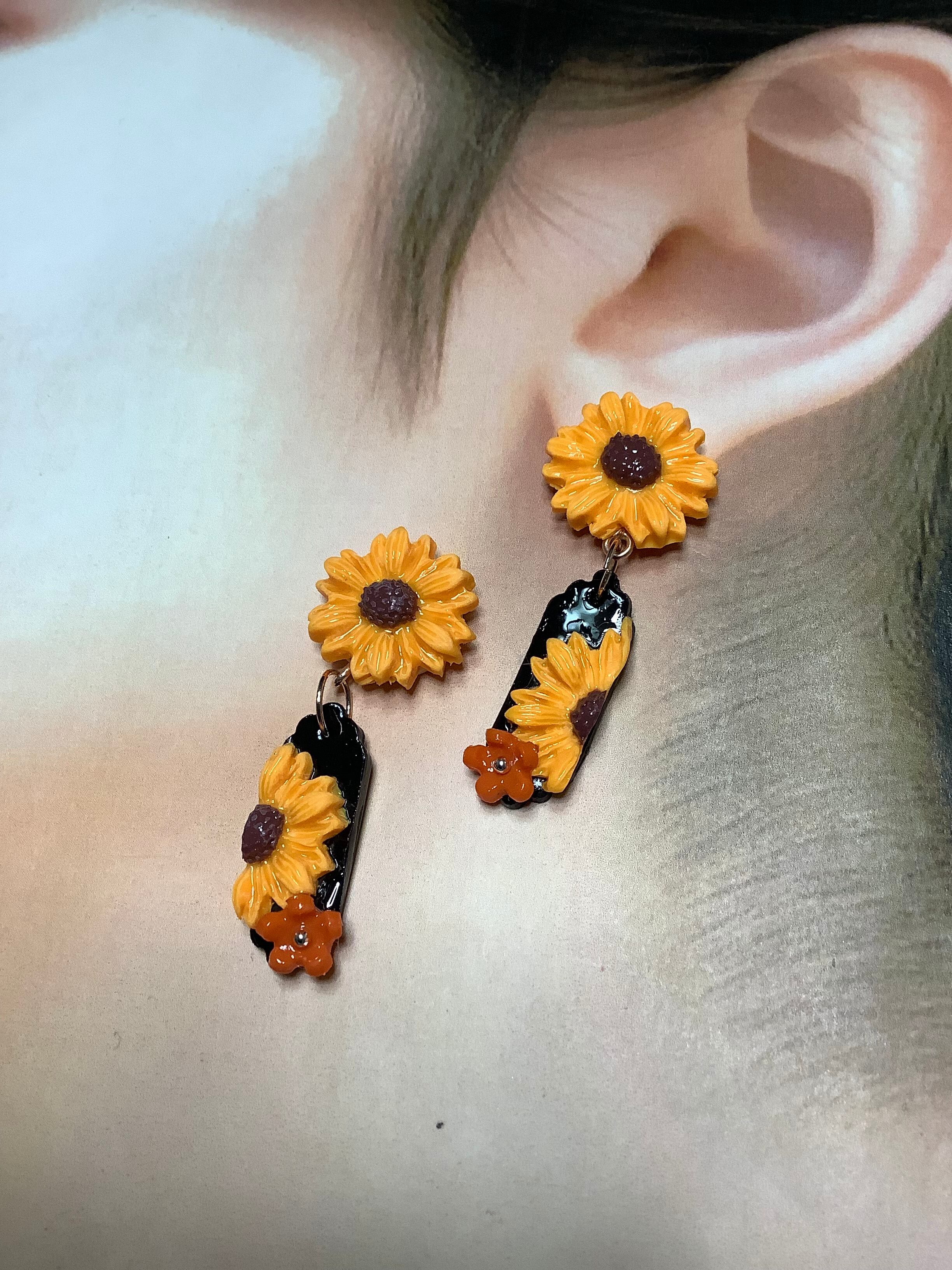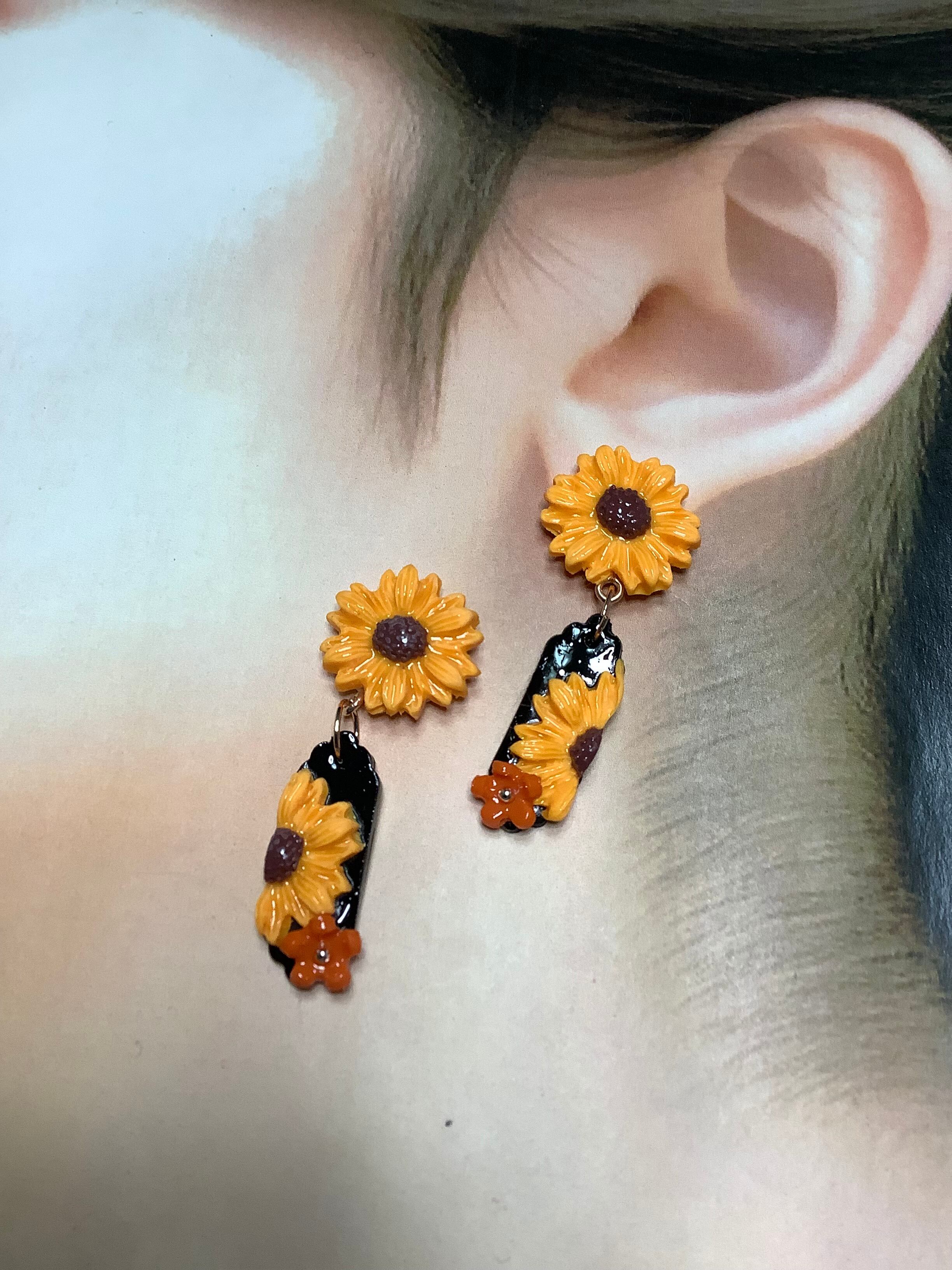 黒地にオレンジのひまわりで、おしゃれに可愛く❤️かわいいです❗️視線を集めること間違いなしです。ポリマークレイの素材感が生み出す独特の表情と、鮮やかなカラーリングが特徴のアイテムです。日常使いにも特別な日にもぴったりで、どんなコーディネートにも合わせやすいアクセサリーとしていかがでしょう