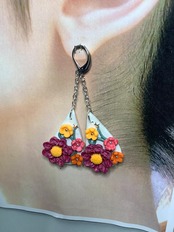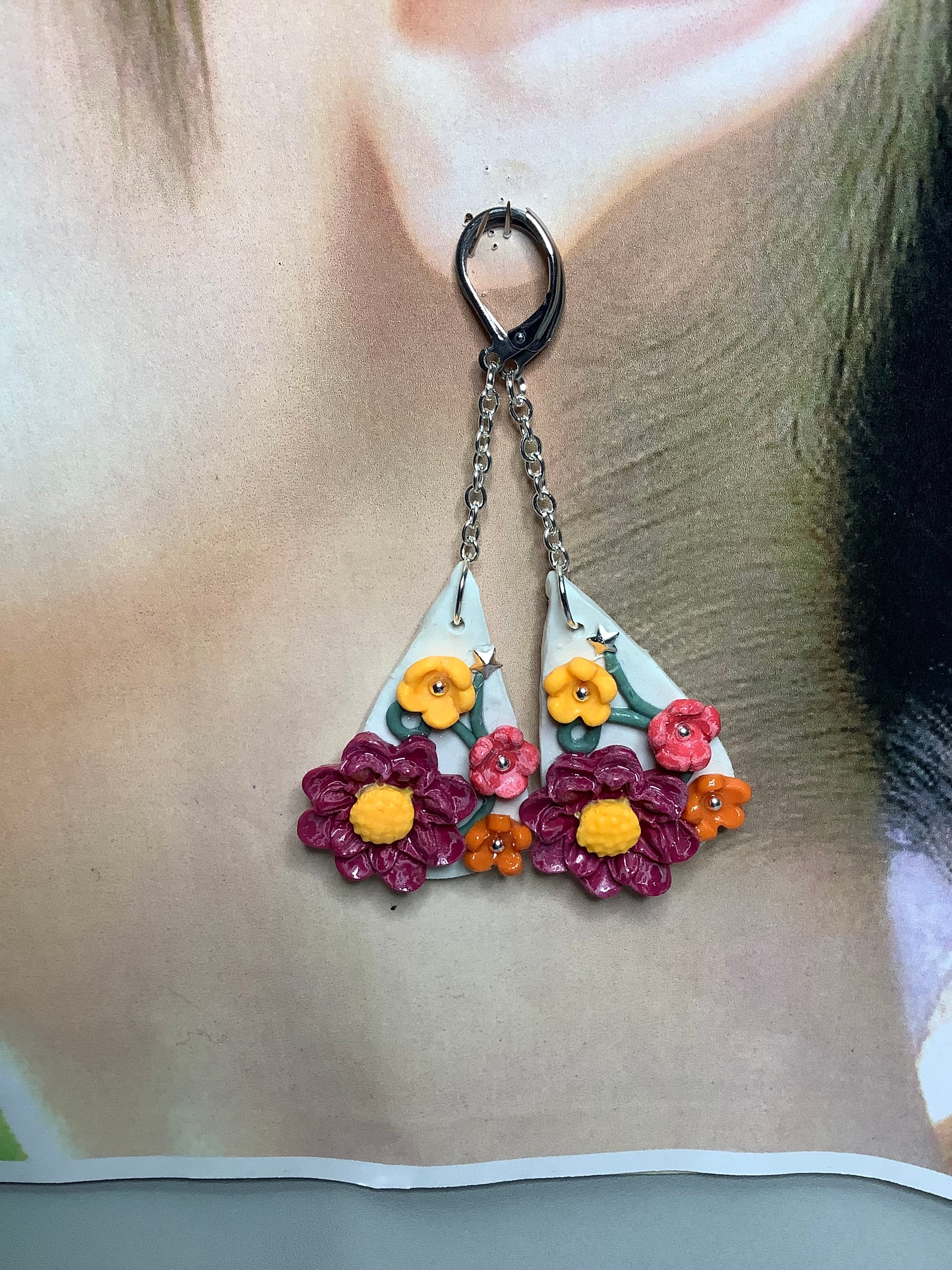 パール地にワイン色、オレンジ、朱色、黄色のお花❗️おしゃれに優しく、可愛く❤️一点物です❗️視線を集めること間違いなしです。ポリマークレイの素材感が生み出す独特の表情と、鮮やかなカラーリングが特徴のアイテムです。日常使いにも特別な日にもぴったりで、どんなコーディネートにも合わせやすいアクセサリーとしていかがでしょう
