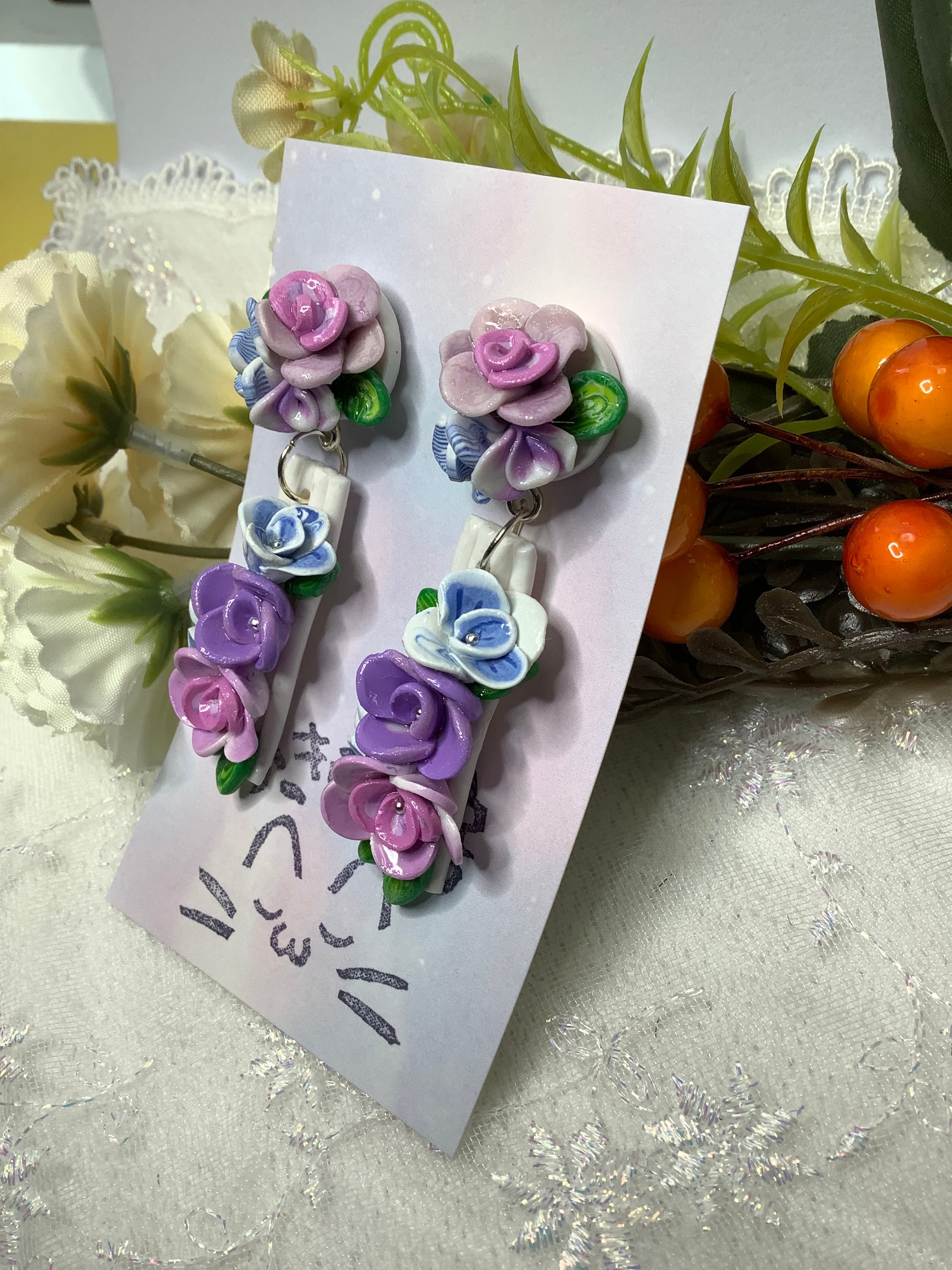 白地に三色のお花、おしゃれにかわいいです❗️視線を集めること間違いなしです。ポリマークレイの素材感が生み出す独特の表情と、鮮やかなカラーリングが特徴のアイテムです。日常使いにも特別な日にもぴったりで、どんなコーディネートにも合わせやすいアクセサリーとしていかがでしょう。