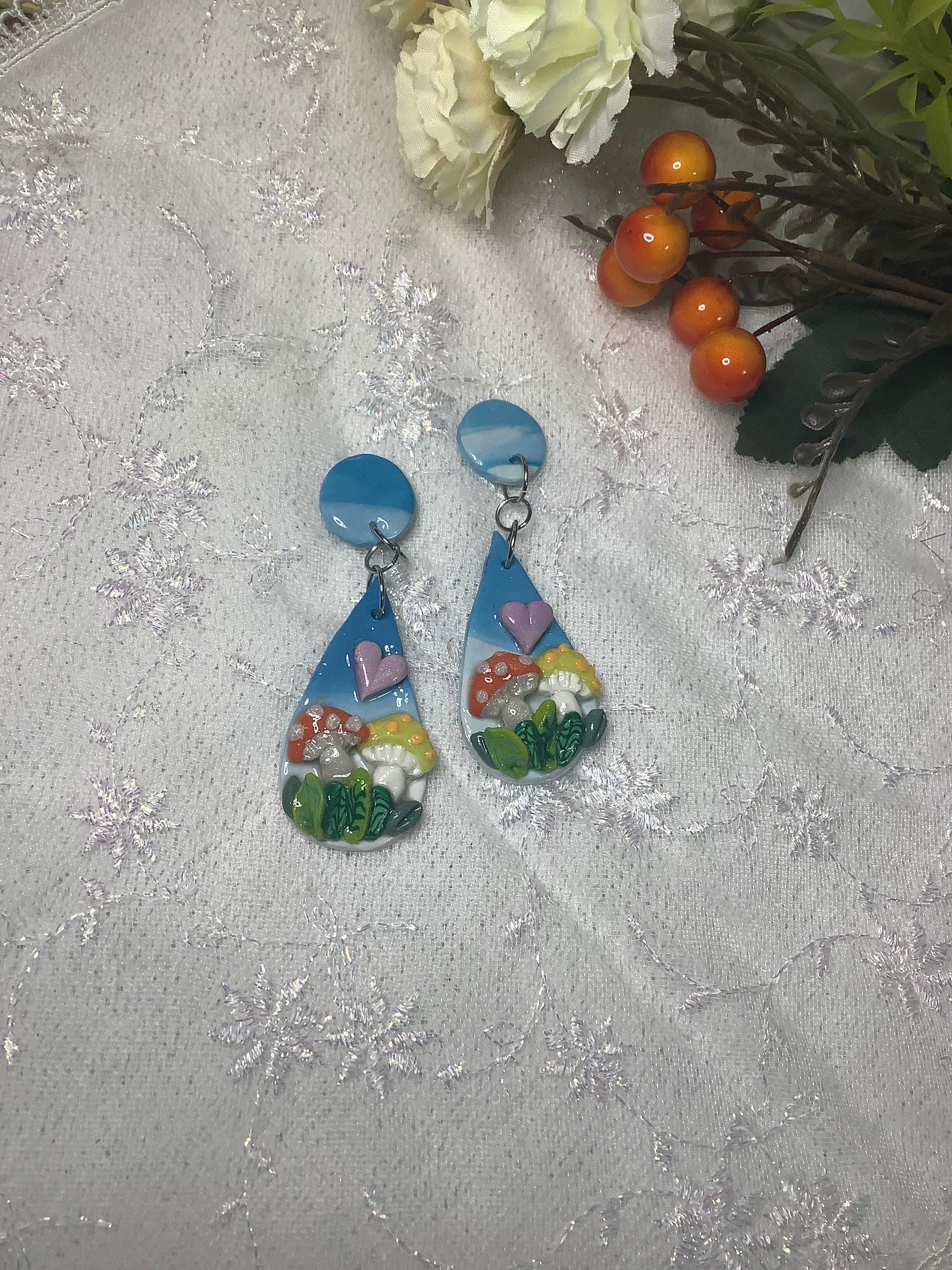 ポリマークレイで作られたきのこのアクセサリーです!このアイテムは、イアリングまたはピアスとしてお選びいただけます❣️