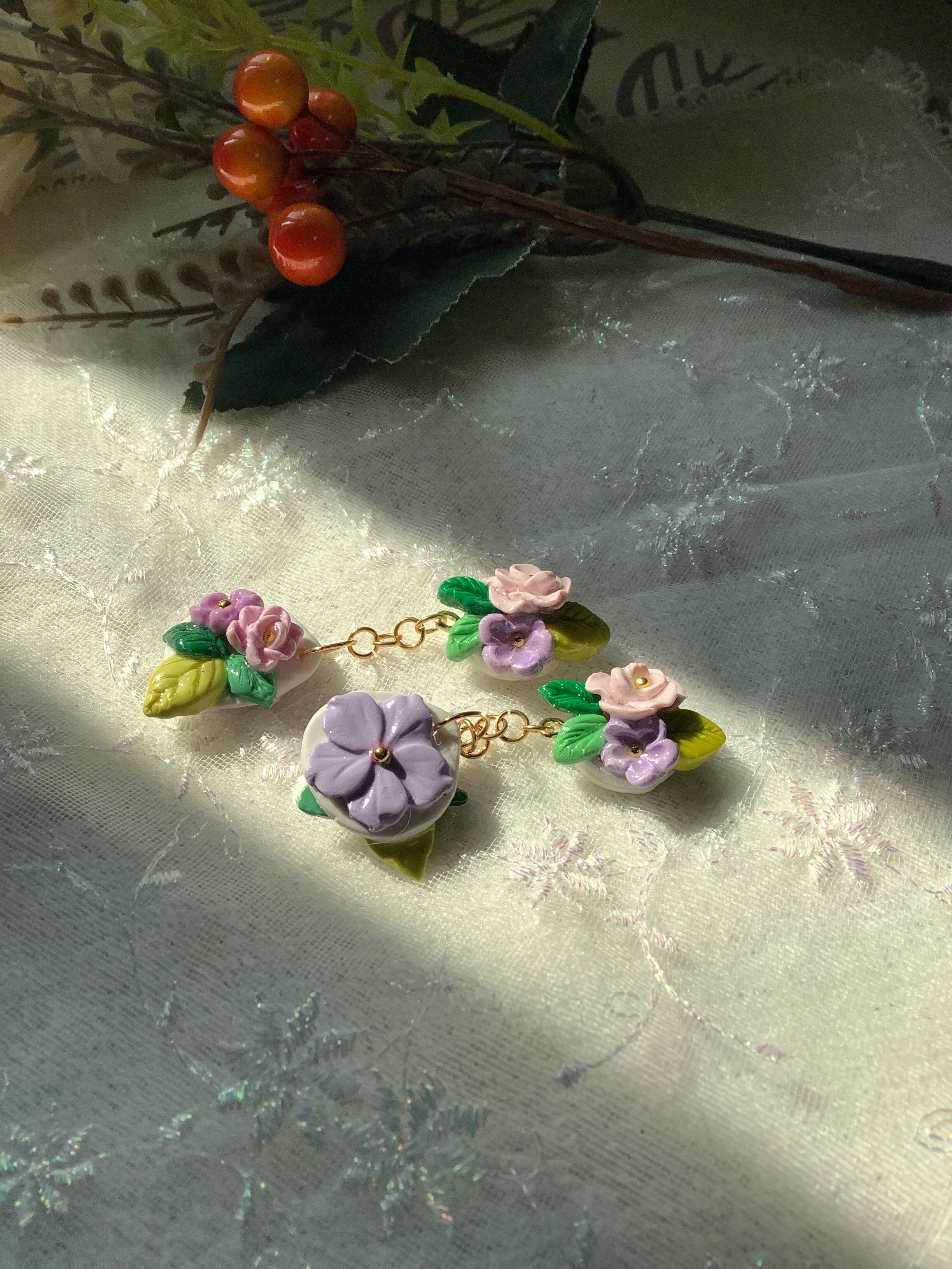 淡いピンクとむらさきの小さなお花で優しく、可愛く❤️一点物です❗️視線を集めること間違いなしです。ポリマークレイの素材感が生み出す独特の表情と、鮮やかなカラーリングが特徴のアイテムです。日常使いにも特別な日にもぴったりで、どんなコーディネートにも合わせやすいアクセサリーとしていかがでしょう