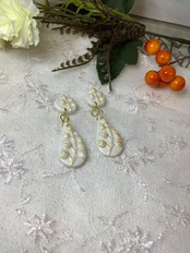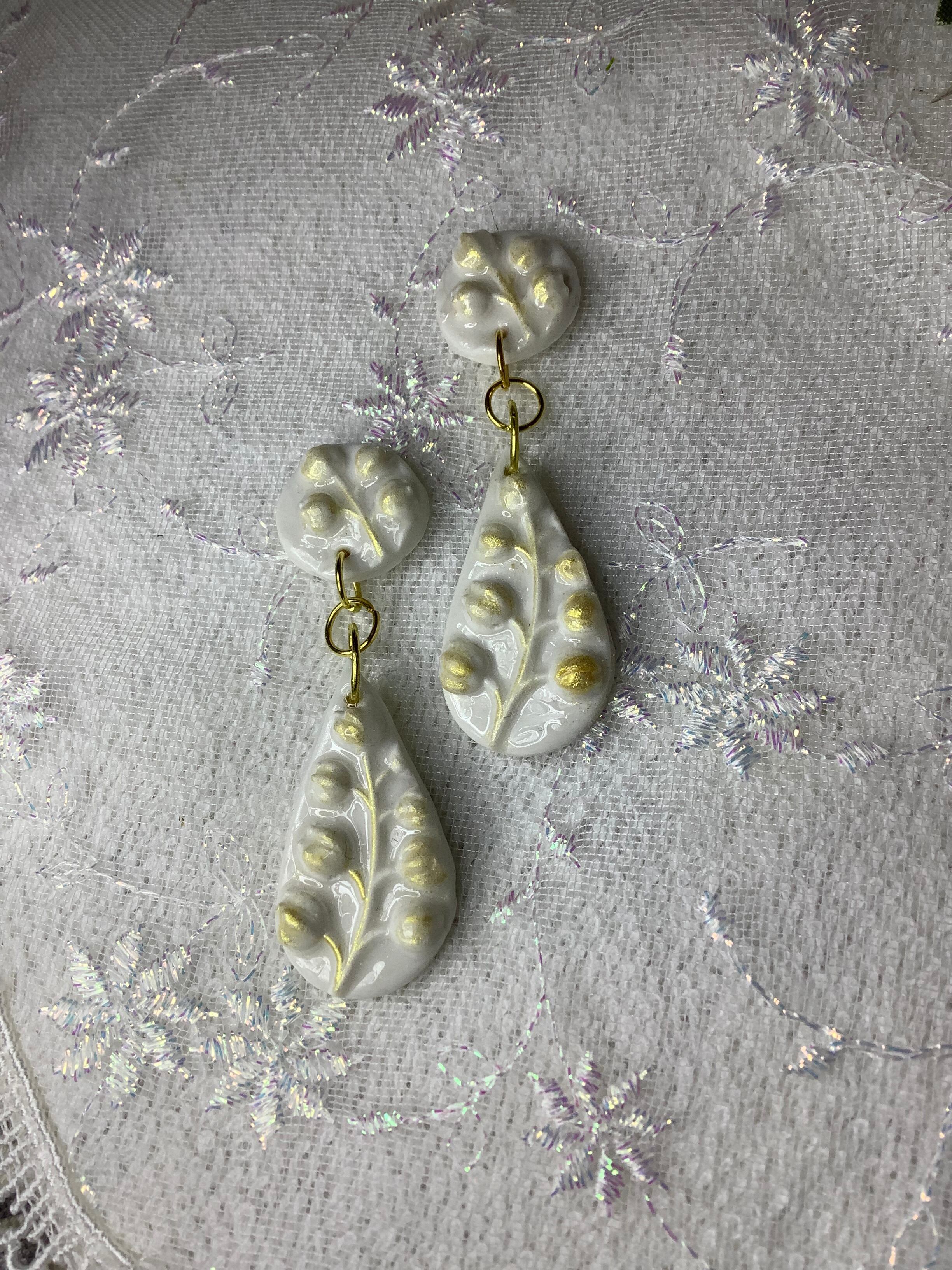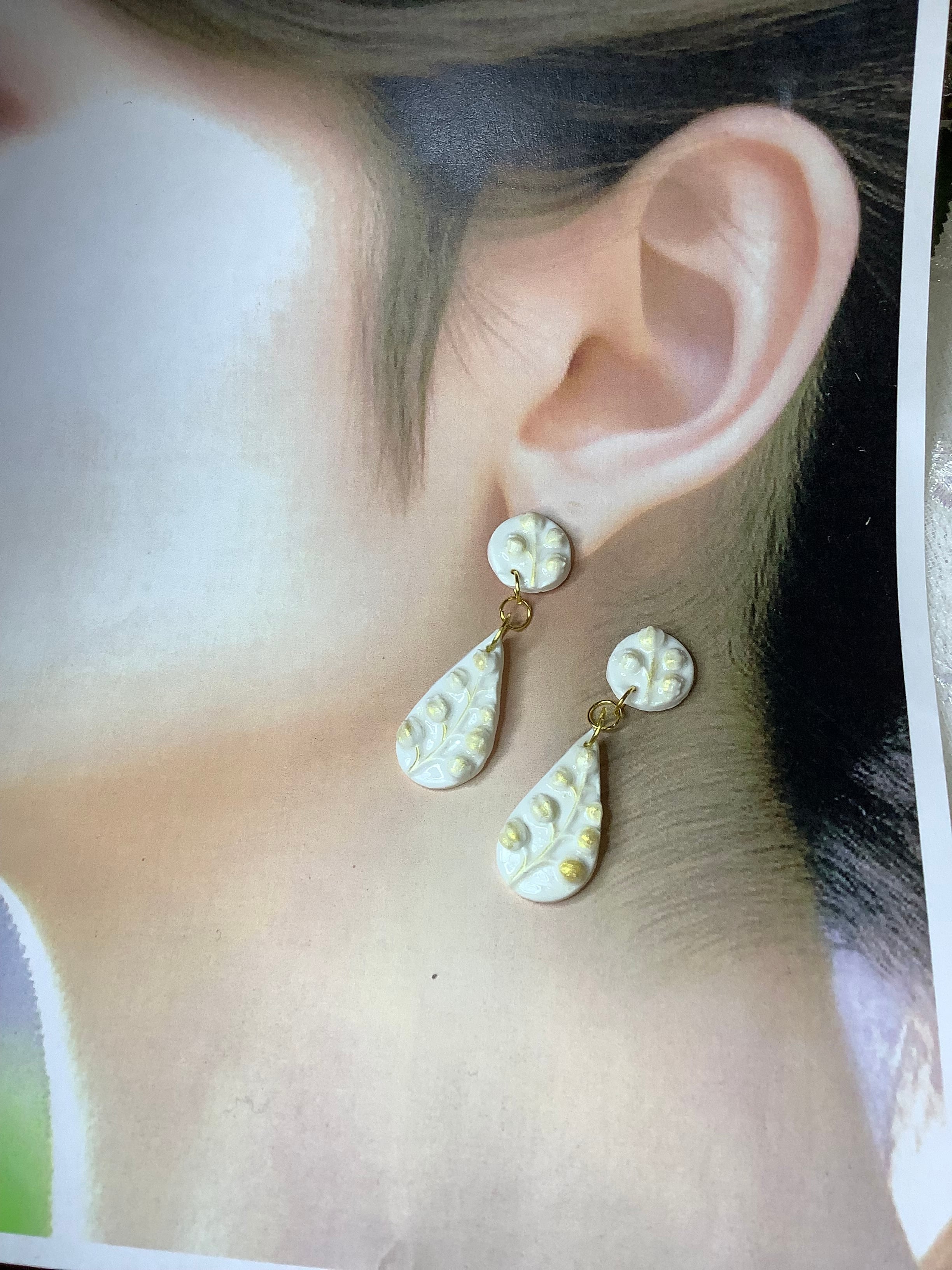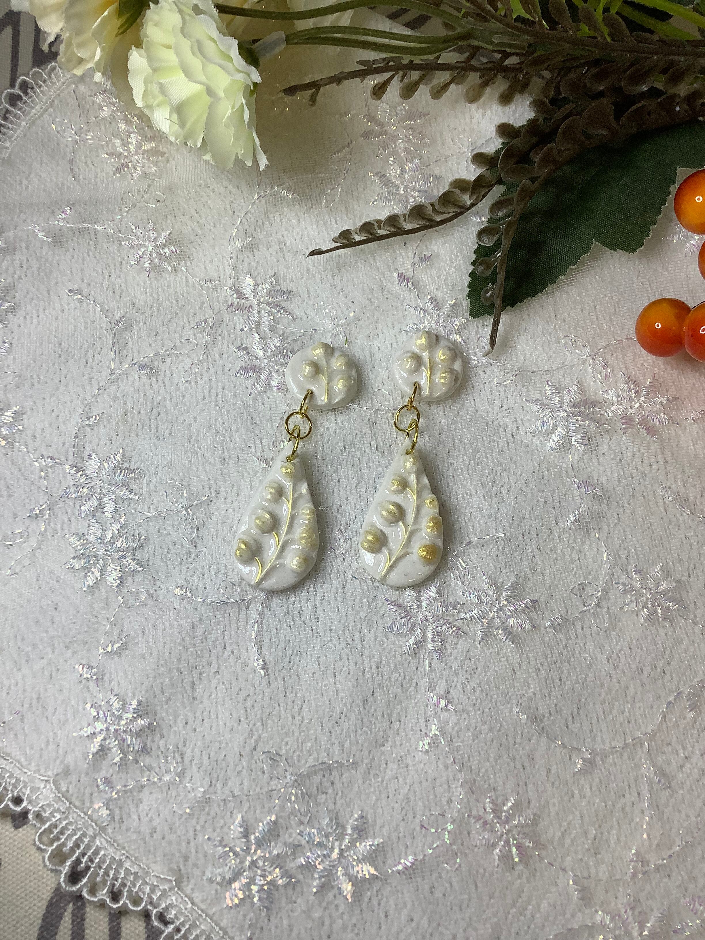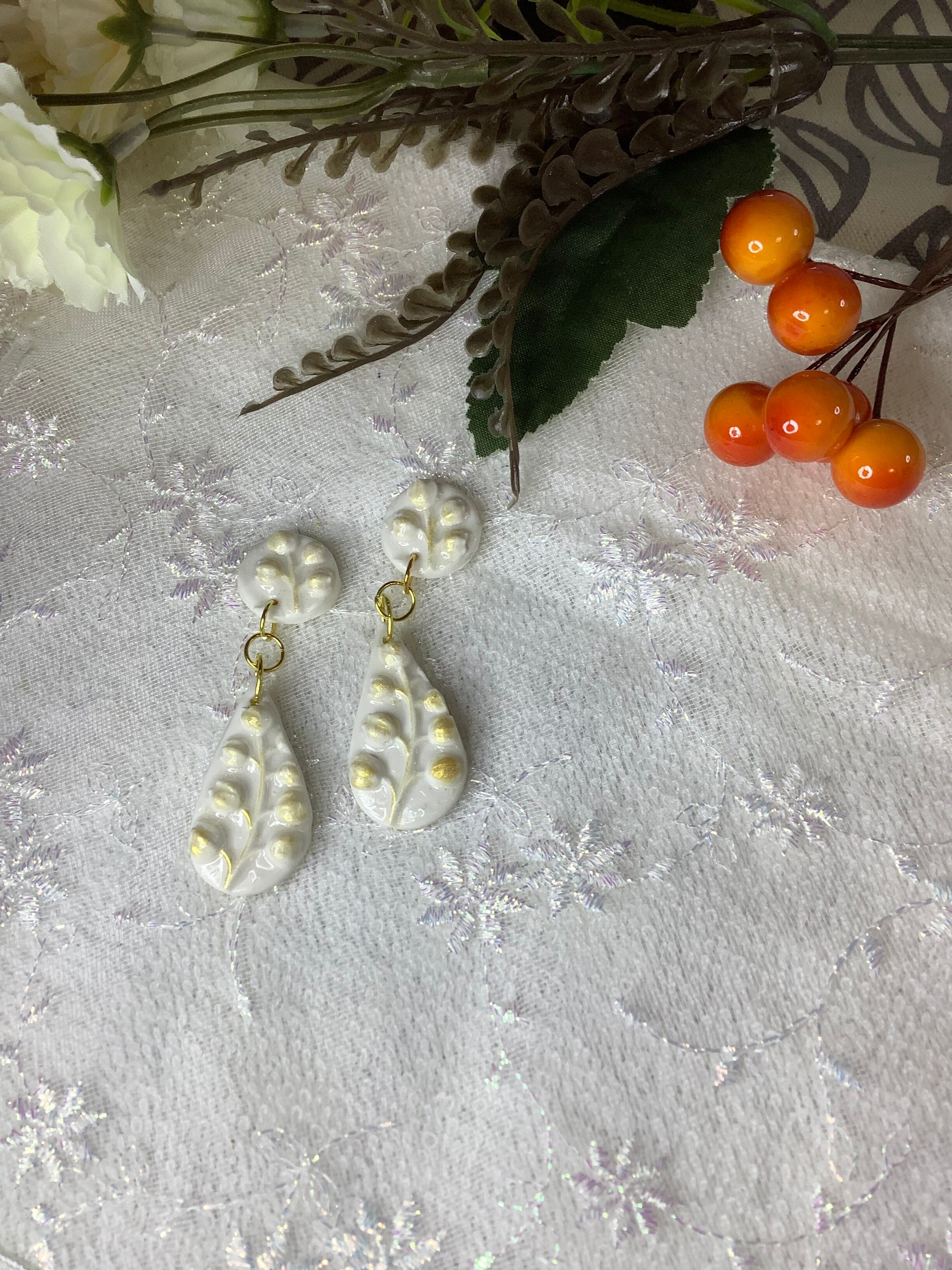白地にゴールドのお花でおしゃれに優しく、可愛く❤️視線を集めること間違いなしです。ポリマークレイの素材感が生み出す独特の表情と、鮮やかなカラーリングが特徴のアイテムです。日常使いにも特別な日にもぴったりで、どんなコーディネートにも合わせやすいアクセサリーとしていかがでしょう