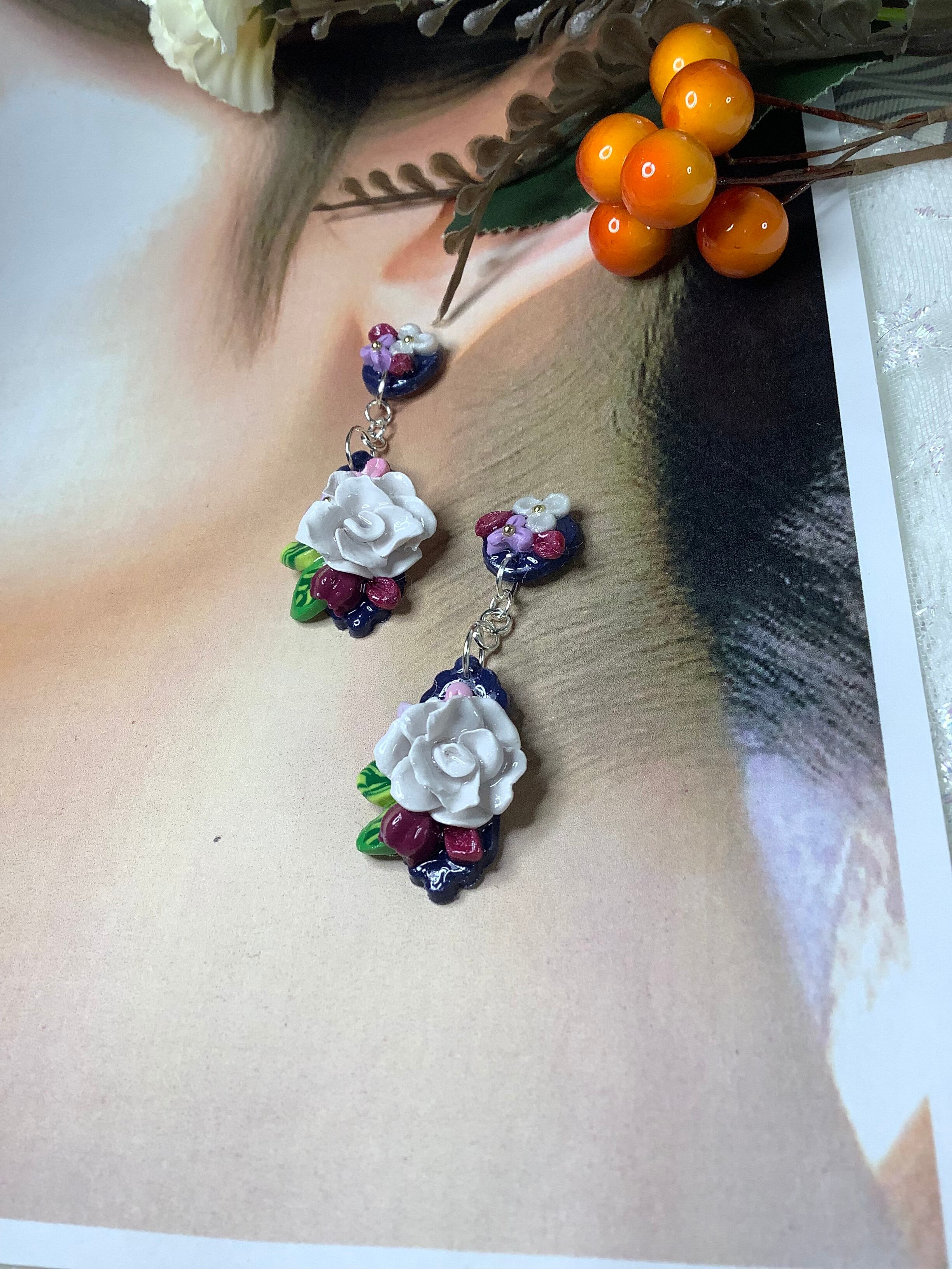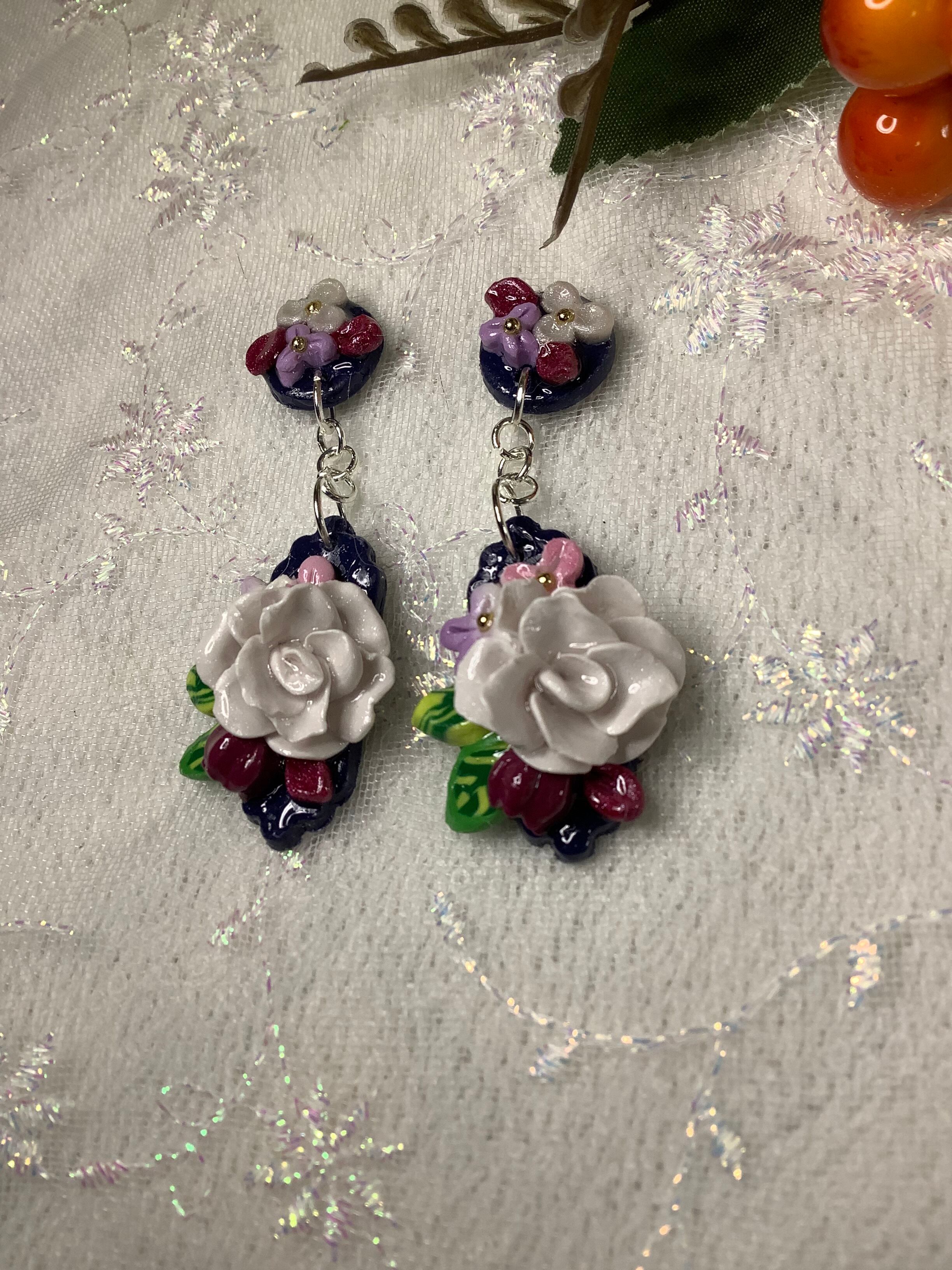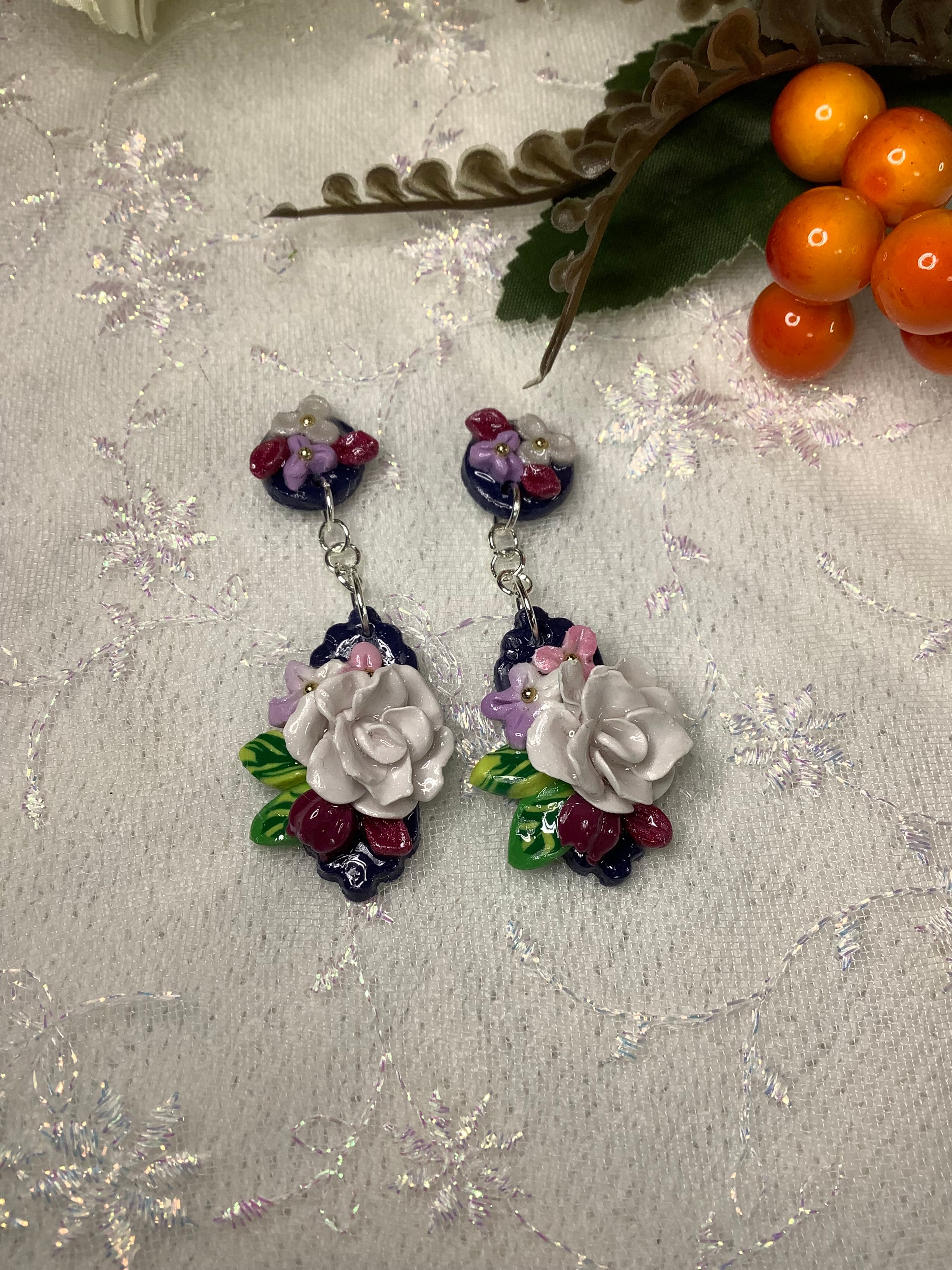 紺色にホワイトやむらさきのお花でおしゃれに優しく、可愛く❤️視線を集めること間違いなしです。ポリマークレイの素材感が生み出す独特の表情と、鮮やかなカラーリングが特徴のアイテムです。日常使いにも特別な日にもぴったりで、どんなコーディネートにも合わせやすいアクセサリーとしていかがでしょう