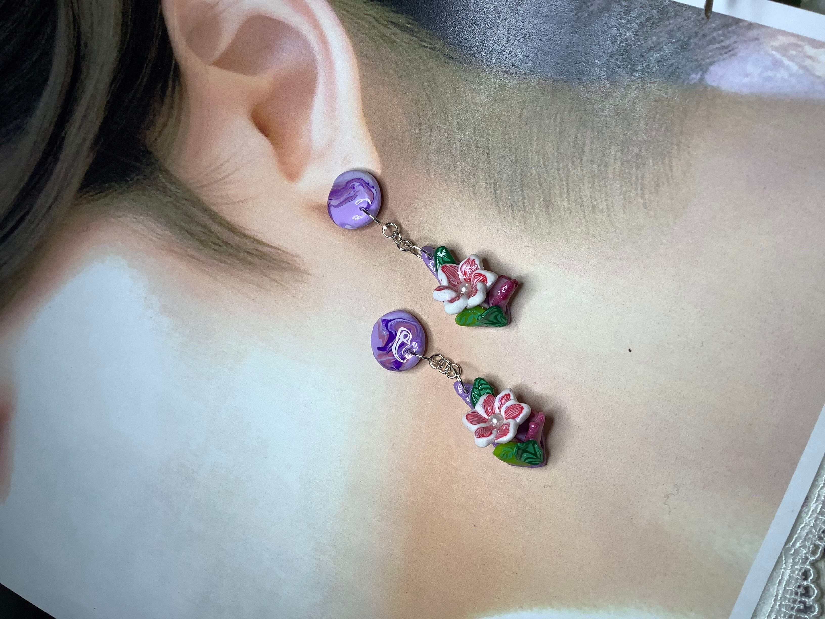 むらさきグラデーションにホワイトと赤のお花で個性的におしゃれに優しく、可愛く❤️視線を集めること間違いなしです。ポリマークレイの素材感が生み出す独特の表情と、鮮やかなカラーリングが特徴のアイテムです。日常使いにも特別な日にもぴったりで、どんなコーディネートにも合わせやすいアクセサリーとしていかがでしょう